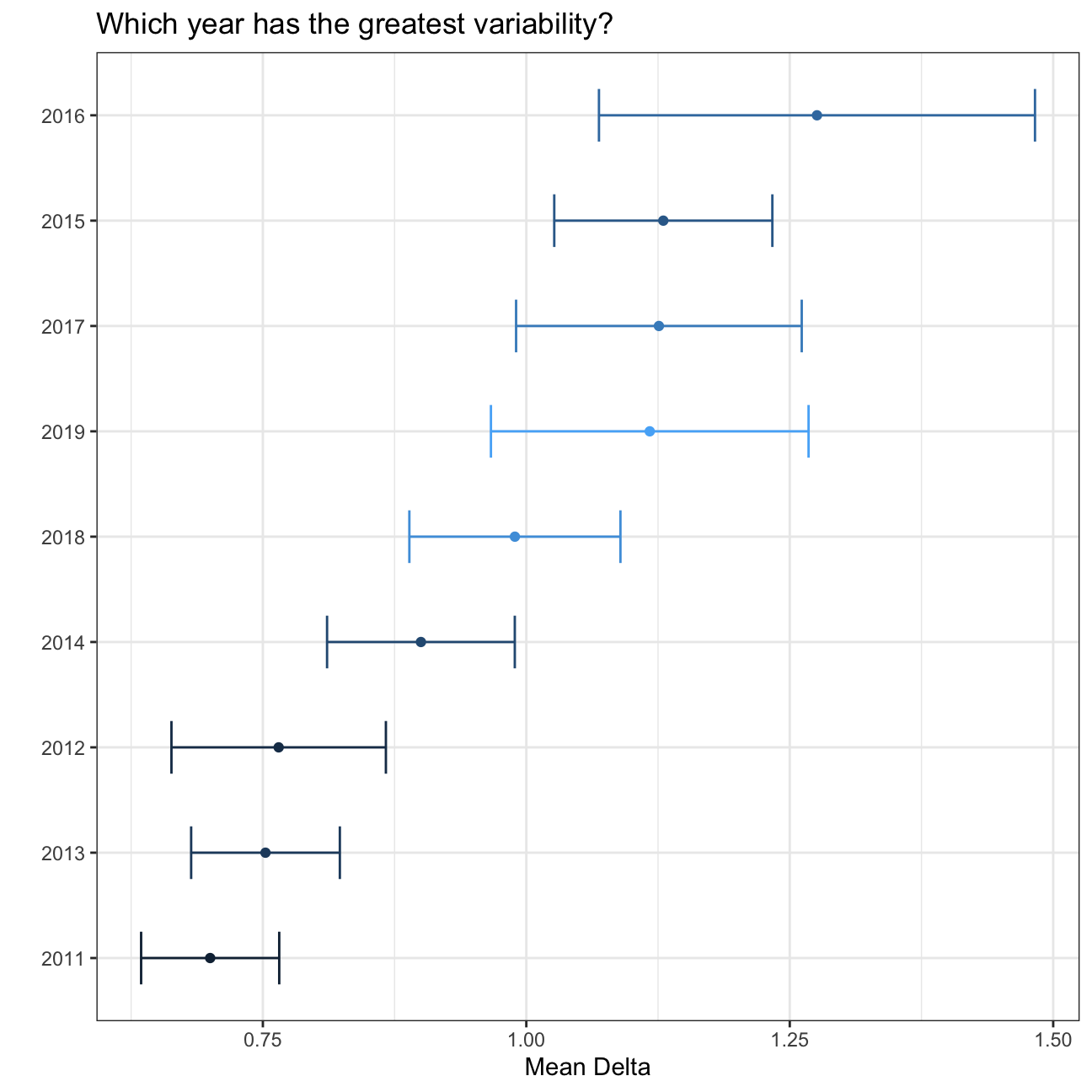 ggplot(formula_ci, aes(x=reorder(Year,mean_delta), y=mean_delta, colour=Year)) +