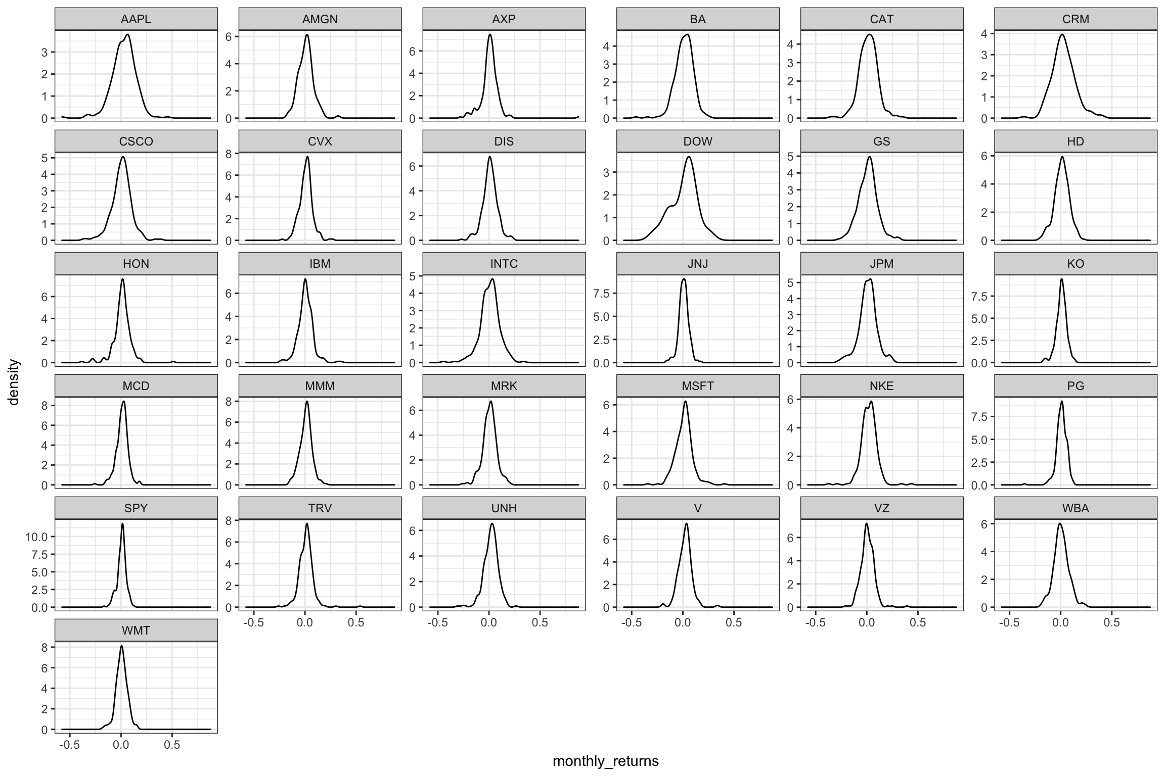 Financial performance analysis depend on returns; If I buy a stock today for 100 and I sell it tomorrow for 101.75, my one-day return, assuming no transaction costs, is 1.75%. So given the adjusted closing prices, our first step is to calculate daily and monthly returns.