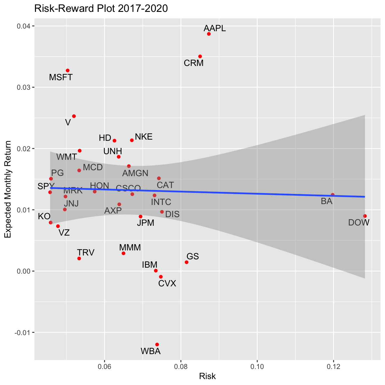 labs(title="Risk-Reward Plot 2017-2020", y="Expected Monthly Return", x="Risk" )+