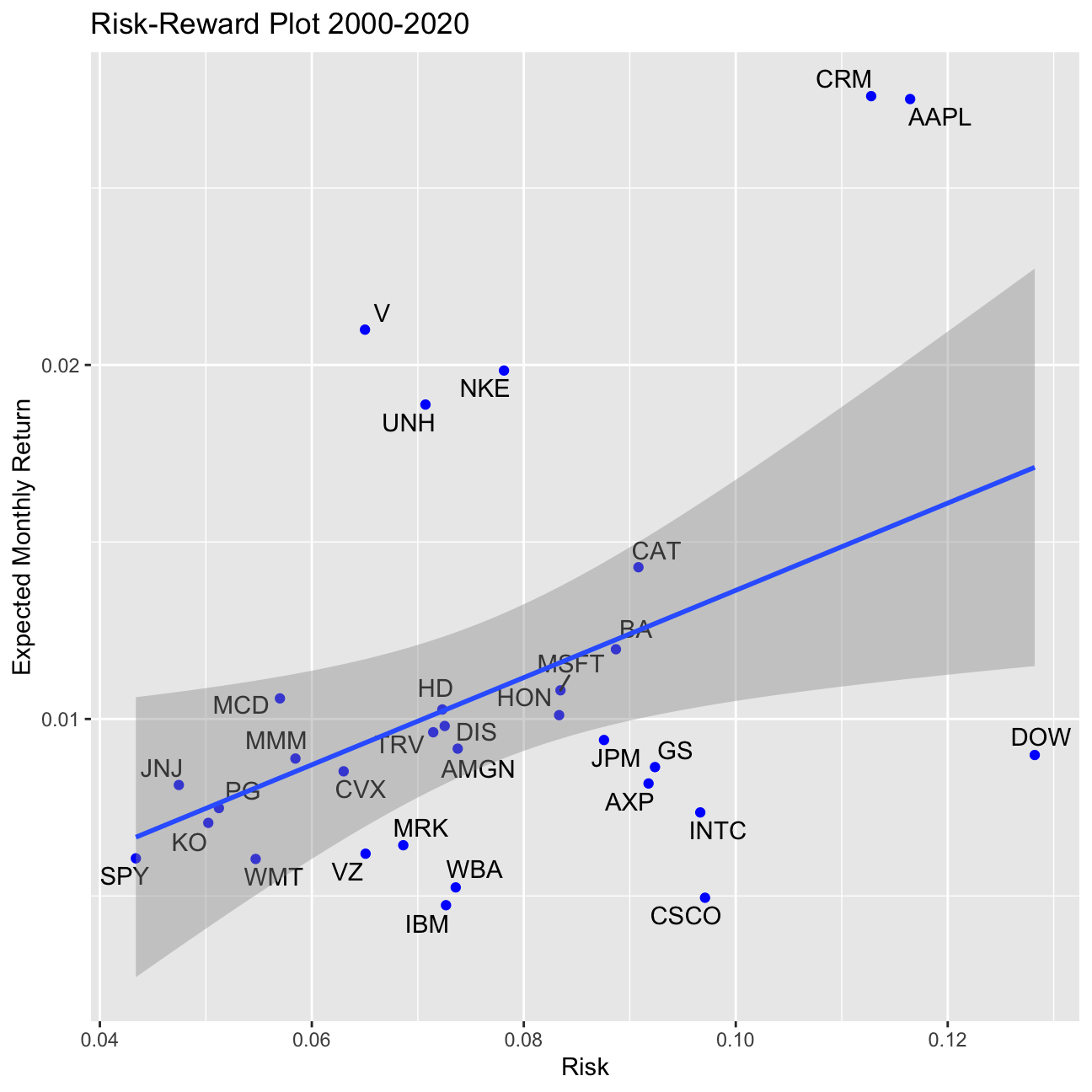 Risk Reward Graph: We can see from the graph that there is an overall trend for higher returns having higher risk. However, we shall not forget that we are looking here at Risk Rewards for a period of only 3 years, which in a stock life is neglectable. In the second chunck of the code we produce the same graph but with more data. Here our pricing data starts in 2000 (in case a stock was introduced later to the DOW Jones Industrial Average, from the beginning of the stock’s lifecycle). Here we can more clearly see our reasoning. The fact that the DOW is “high” risk, is because it is not an actual stock, but rather the index, that is comprised of all the 30 stocks in the index, and as we have outliers in our 30 companies (some that produce higher returns with lower risk, and other that are considered high risk but only have small returns) we arrive at the conclusion that is the reason why the DOW is so much to the right.