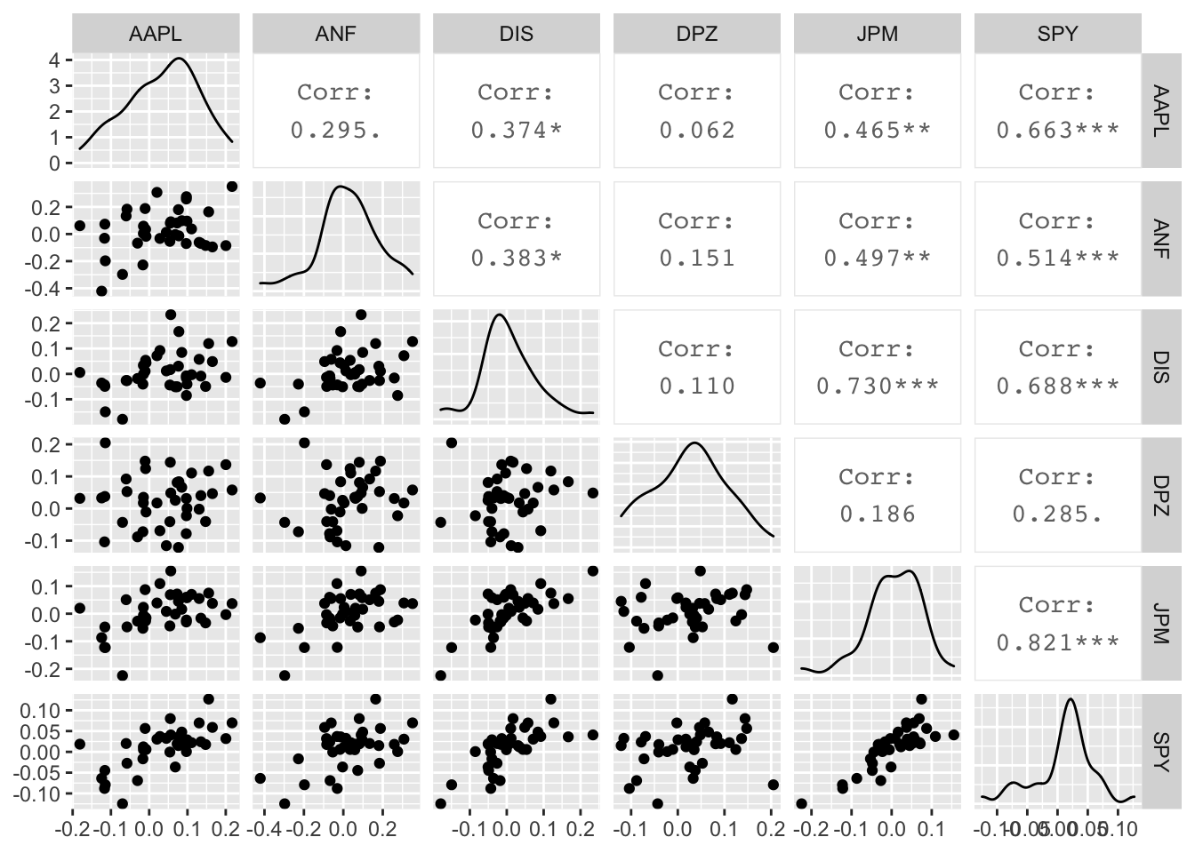 Besides these exploratory graphs of returns and price evolution, we also need to create scatterplots among the returns of different stocks. ggpairs crates a scatterplot matrix that shows the distribution of returns for each stock, and a matrix of scatter plots and correlations. This may take a while to run, but look at the last row, the last column and along the diagonal.
